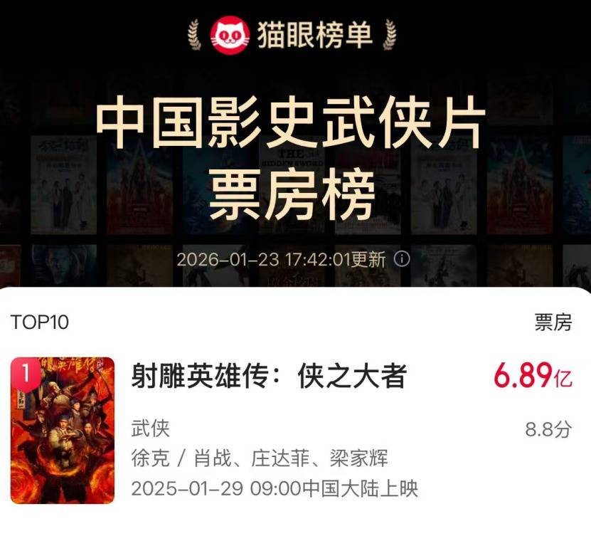 要知道,眼下中国影史武侠片票房冠军是去年春节档的《射雕英雄传:侠之大者》,可它的总票房也不过6亿多。
