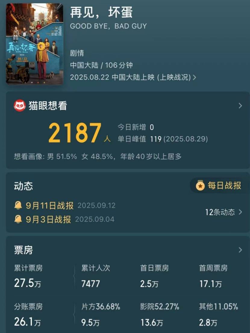 影片上映8天,票房才1200多万,分账票房仅1000万出头。