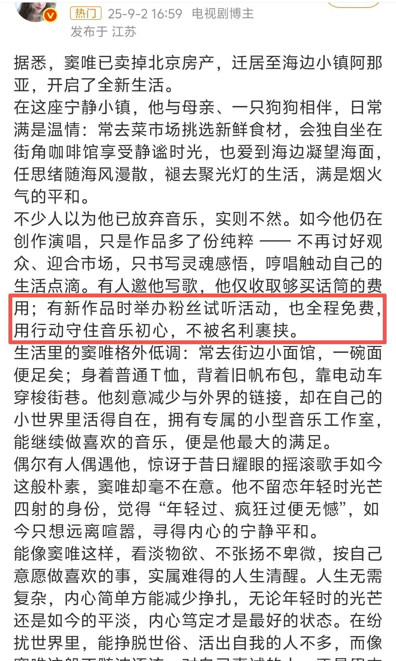 如今他在河北秦皇岛的阿那亚住了好几年,日子过得平静又踏实。网友偶遇他,打个招呼,他也会笑着回应。在他看来,搞音乐、过日子,都是再普通不过的事儿,犯不着搞得神神叨叨。所谓的“窦仙”,不过是外界给他披上的光环,他自己只想做个自在的普通人。